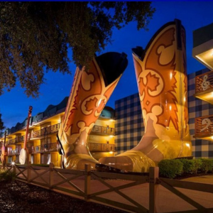 La sección Country Fair de Disney’s All-Star Music Resort está decorada por un gigantesco par de botas vaqueras, de tres pisos de altura, además de grandes instrumentos musicales.
