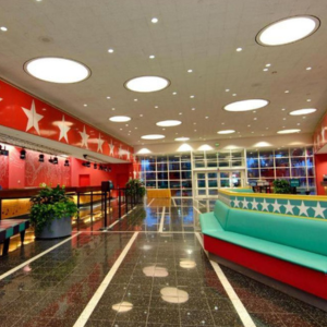 El área del Rock Inn está adornada con grandes instrumentos como guitarras eléctricas, micrófonos y divertidos colores neón. Su elemento decorativo principal es una máquina tocadiscos gigante.
