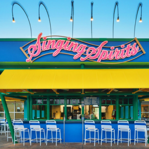 Marcha a tu propio ritmo para el desayuno, el almuerzo y la cena en esta amplia feria de comida con temática musical, con una amplia variedad de puestos de comida más un mercado de delicatessen.