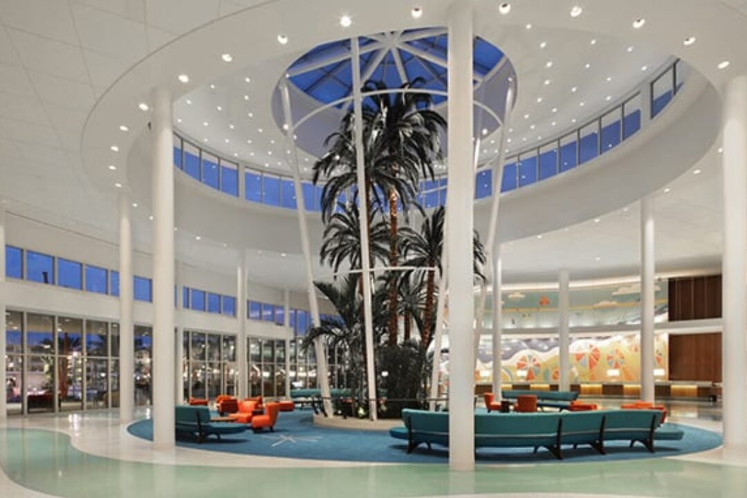 Cabana Bay Beach Resort propone un viaje directo a la Florida de los años 50 y 60, con una estética retro llena de colores, neones y detalles vintage que crean un ambiente alegre y descontracturado. Desde el primer momento se siente como un hotel pensado para disfrutar, recorrer y vivir, no solo para dormir después de un día de parques.