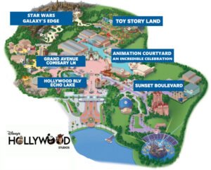 Ingresando al parque pasarán estarán en Hollywood Boulevard, la avenida principal que culmina en la réplica de fachada del Teatro Chino de Los Angeles donde funciona la atracción «Mickey & Minnie Runaway Railway», inmeditamente podrán obtener un mapa del parque en español, con todas las atracciones, restaurantes, gift-shops, puntos de encuentro con personajes, baños y otra información sobre el parque.